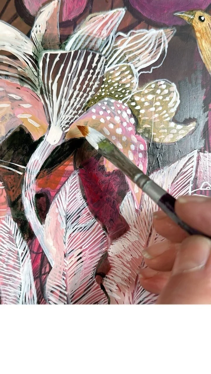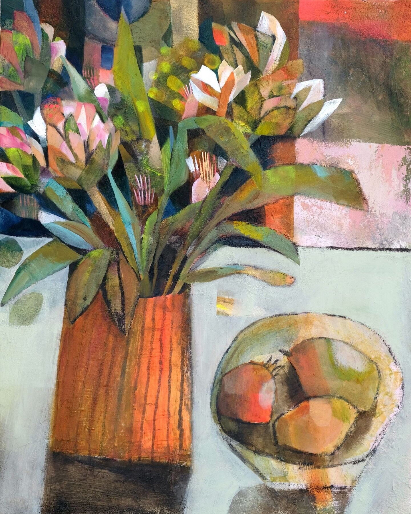 Artworks are created with acrylic paint and water- based mixed media and fall into three categories: still life paintings, landscapes and floral-themed art. The last is the main source of the design and licensing component of my art practice.